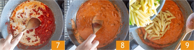 Fügen Sie die Sahne zur Sauce hinzu 7, rühren Sie gut um 8 und lassen Sie die Sauce weitere 5-7 Minuten eindicken. Die Penne al dente abgießen und in die Pfanne geben 9.