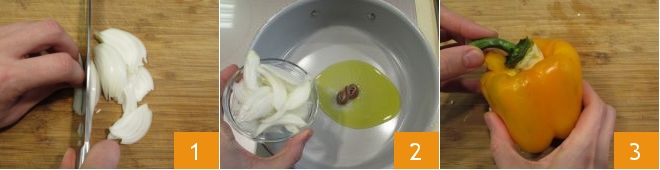 Um die Penne mit Paprika zuzubereiten, schälen Sie die weiße Zwiebel und schneiden Sie sie fein 1. Erhitzen Sie in einem Topf das Olivenöl mit zwei Anchovis, die aus dem Konservierungsöl abgetropft wurden, und den geschnittenen Zwiebeln 2. Dünsten Sie die Zwiebel mit wenig Wasser, bis sie weich ist, das dauert etwa 10 Minuten. In der Zwischenzeit setzen Sie einen Topf mit reichlich Wasser auf den Herd, den Sie salzen, sobald es kocht: Er wird später zum Kochen der Pasta benötigt. Waschen Sie nun die Paprika unter fließendem Wasser, entfernen Sie den Stiel 3.
