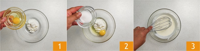 Um die Pfannkuchen mit griechischem Joghurt zuzubereiten, gebt zuerst das Joghurt zusammen mit dem Ei 1 und dem Zucker 2 in eine Schüssel. Rührt alles mit einem Schneebesen, bis es gut vermischt ist 3.
