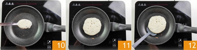 Erhitzt in einer separaten, antihaftbeschichteten Pfanne mit einem Durchmesser von 20 cm und, wenn sie heiß ist, gebt 1 oder 2 Esslöffel der Masse hinein 10, um einen Pfannkuchen mit einem Durchmesser von etwa 8 cm zu formen 11. Sobald sich Blasen bilden, wendet den Pfannkuchen mit einem Spatel 12.