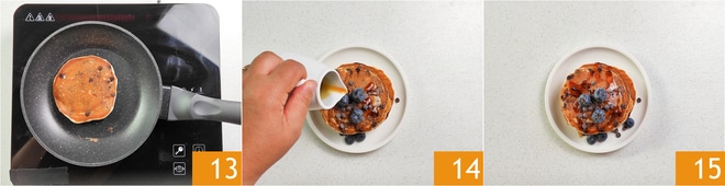 Führt das Garen auch auf der anderen Seite fort 13. Macht so weiter, bis alle Zutaten aufgebraucht sind; mit diesen Mengenangaben erhaltet ihr 10 Stück. Serviert die Pfannkuchen mit Joghurt warm, garniert mit Ahornsirup oder Honig 14 15.
