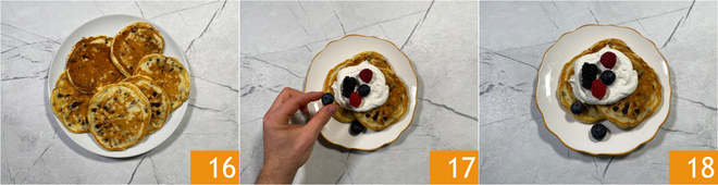 Gebt die Pancakes nach und nach auf einen Teller 16. Garniert die Pancakes mit einem Löffel Joghurt, gemischt mit etwas Milch, und ein paar Beeren 17. Fertig sind eure Pancakes mit griechischem Joghurt 18!