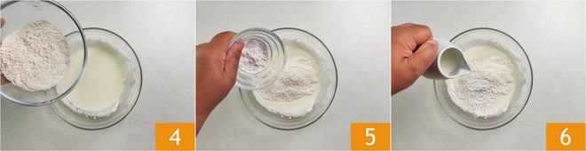 Gebt dann das Mehl 4, das gesiebte Backpulver 5 und die Milch 6 hinzu.