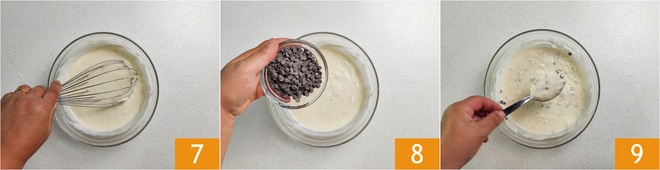 Rührt nochmals, bis ihr eine homogene und klumpenfreie Masse erhaltet 7. Fügt schließlich die Schokoladenstückchen hinzu 8 und mischt sie in den Teig 9.