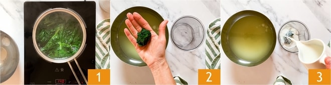 Um die Crêpes mit Kürbis, Speck und Walnüssen zuzubereiten, beginnen Sie mit dem Teig. Kochen Sie den Spinat in etwas kochendem Salzwasser für 3 Minuten 1, dann abgießen und in Eiswasser legen. Drücken Sie ihn aus, geben Sie ihn in das Glas eines Mixers und pürieren Sie ihn mit der Milch 2.