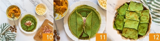 Backen Sie die Crêpes, indem Sie die Antihaftpfanne leicht einfetten. Wenden Sie sie nur einmal, sobald sie sich von der Pfanne lösen. Jetzt füllen Sie sie: Geben Sie auf jeden Crêpe einen Löffel Kürbiscreme, etwas Speck, grob gehackte Walnüsse und in Würfel geschnittenen Scamorza-Käse 10. Falten Sie zwei Ränder zur Mitte hin 11 und rollen Sie ihn auf. Legen Sie die Crêpes auf ein mit Backpapier ausgelegtes Backblech und backen Sie sie 10-12 Minuten in einem vorgeheizten statischen Ofen bei 180°.