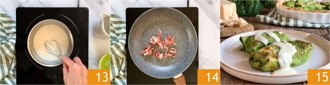 Bereiten Sie in der Zwischenzeit das Fondue mit dem geriebenen Käse und der Milch vor. Kochen Sie es bei mittlerer Hitze 4 Minuten lang 13, bis es glatt ist. In einer Pfanne braten Sie auch den restlichen Speck 14. Nehmen Sie die gefüllten grünen Crêpes aus dem Ofen, gießen Sie das Fondue darüber 15, den knusprigen Speck und ein paar zerbröselte Walnusskerne. Servieren Sie die Crêpes noch heiß!