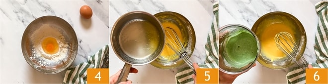 Schmelzen Sie die Butter bei sehr niedriger Hitze und lassen Sie sie abkühlen. Sieben Sie das Mehl in eine Schüssel, fügen Sie die Eier hinzu 4 und mischen Sie gut mit einem Schneebesen. Fügen Sie die geschmolzene Butter 5, die Milch-Spinat-Mischung 6 und das Salz hinzu. Lassen Sie den Teig eine halbe Stunde im Kühlschrank ruhen.