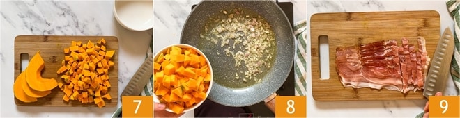 Schneiden Sie die Schalotte fein und den Kürbis in Würfel 7. Braten Sie die Schalotte in einer Antihaftpfanne mit einem Schuss Öl an. Fügen Sie den Kürbis hinzu 8, würzen Sie mit Salz, Pfeffer und Muskatnuss. Lassen Sie die Würfel so lange kochen, bis sie weich werden, und fügen Sie bei Bedarf ein paar Esslöffel Wasser hinzu. Wenn er gar ist, zerdrücken Sie ihn mit einer Gabel und stellen Sie ihn beiseite. Schneiden Sie den Speck in Streifen 9 und heben Sie ein Drittel davon auf.