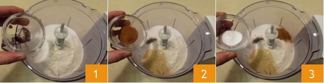 Um den Lebkuchen zuzubereiten, geben Sie das Mehl, das Nelkenpulver 1, das Ingwer- und das Zimtpulver 2 sowie das Natron 3 in die Schüssel eines Mixers