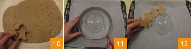 Nach der erforderlichen Zeit nehmen Sie den Teig aus dem Kühlschrank und rollen ihn zu einer Scheibe von 1 cm Dicke aus. Stechen Sie etwa 30 Kekse mit den Ausstechformen aus, die für die Herstellung von 2 Lebkuchenkränzen benötigt werden (Sie können die Reste schnell wieder zusammenkneten und erneut ausrollen, um den Teig vollständig zu verwenden). Um einen perfekten Kreis für Ihren Kranz zu erstellen, platzieren Sie eine umgedrehte Schüssel in der Mitte des mit Backpapier ausgelegten Backblechs und zeichnen Sie darum einen Kreis. Legen Sie die Kekse rundherum und überlappen Sie sie leicht: Ein Band soll zwischen ihnen hindurchgehen können, und Sie benötigen 15 Plätzchen für jeden Lebkuchenkranz 12.