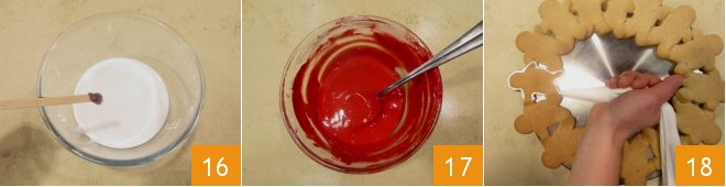bis Sie eine flüssige Konsistenz erhalten. Dann geben Sie die Hälfte der Glasur in eine kleine Schüssel und fügen Sie den Farbstoff hinzu, bis Sie ein leuchtendes Rot erhalten (16-17). Geben Sie die beiden Glasuren in zwei Einweg-Spritzbeutel ohne Tülle, bei denen Sie an der Spitze ein kleines Loch machen können. Verzieren Sie den Rand der inzwischen kalten Kekse 18