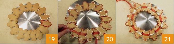 indem Sie die beiden Glasuren abwechseln 19, dann ziehen Sie ein Band zwischen den Keksen hindurch, sodass es sichtbar ist 20, und wiederholen Sie die gleichen Schritte auch für den zweiten Lebkuchenkranz, damit sie einsatzbereit sind 21.