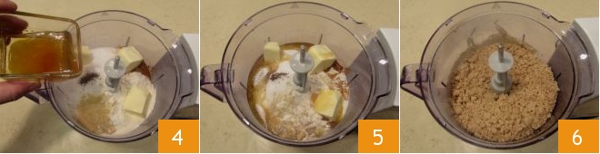 den Zucker und eine Prise Salz. Fügen Sie dann auch die geriebene Muskatnuss, die kalte Butter aus dem Kühlschrank in Stücken und den Honig hinzu 4. Wenn Sie alle Zutaten hinzugefügt haben 5, betätigen Sie die Klingen intermittierend, um den Teig nicht zu sehr aufzuwärmen, und erstellen Sie eine sandige Mischung 6.