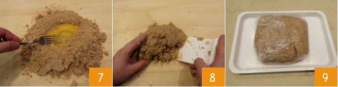 Stürzen Sie die Mischung auf eine Arbeitsfläche und formen Sie einen Brunnen, dann fügen Sie das Ei hinzu 7 und vermengen Sie es zunächst mit einer Gabel und dann schnell mit den Händen, um den Teig nicht zu sehr aufzuwärmen. Sammeln Sie den Teig 8, formen Sie eine Kugel, drücken Sie sie leicht flach und wickeln Sie sie in Frischhaltefolie 9. Lassen Sie den Teig mindestens 30 Minuten im Kühlschrank ruhen.