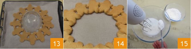 Backen Sie die Kekse 13 im vorgeheizten statischen Ofen bei 170°C für 15 Minuten (bei Umluft bei 150°C für etwa 8-10 Minuten). Sobald sie gebacken sind, nehmen Sie sie aus dem Ofen und lassen Sie sie etwas abkühlen 14, dann stürzen Sie sie auf ein Gitter, um sie vollständig abkühlen zu lassen. In der Zwischenzeit bereiten Sie die Glasur vor: Schlagen Sie das Eiweiß mit einem elektrischen Mixer, dann fügen Sie nach und nach den Puderzucker hinzu 15.