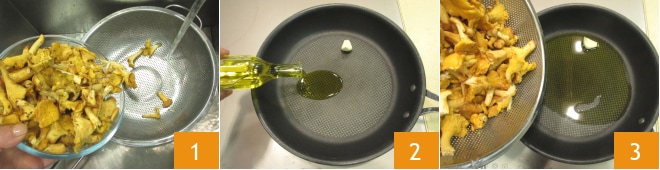 Um das Pfifferlingsomelett zuzubereiten, reinigen Sie zuerst die Pilze unter fließendem Wasser 1. In einer Pfanne mit einem Durchmesser von ca. 22 cm (dieselbe Pfanne wird auch zum Kochen des Omeletts verwendet) erhitzen Sie das Öl mit der Knoblauchzehe 2, dann fügen Sie die Pfifferlinge hinzu 3.
