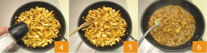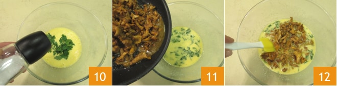 Salzen 10, pfeffern und mischen, dann die Pilze hinzufügen 11 und erneut mischen, um alles zu verbinden 12.