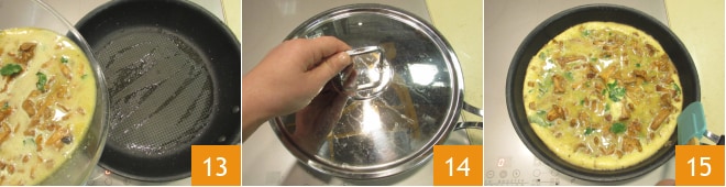 Die Eiermischung in dieselbe Pfanne gießen, in der Sie die Pilze gekocht haben 13. Mit einem Deckel abdecken 14 und bei mittlerer Hitze 6-7 Minuten kochen, dann die Ränder des Omeletts mit einem Spatel lösen 15.