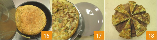 Das Omelett mit Hilfe eines Deckels oder eines Tellers wenden, es erneut in die Pfanne gleiten lassen 16 und weitere 6-7 Minuten kochen. Sobald es fertig ist, das Pfifferlingsomelett auf einen Teller geben 17 und servieren 18!
