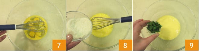Die Eier in eine Schüssel geben und mit einem Schneebesen schlagen 7, dann den geriebenen Grana Padano DOP 8 und die Petersilie hinzufügen 9.