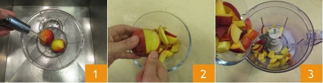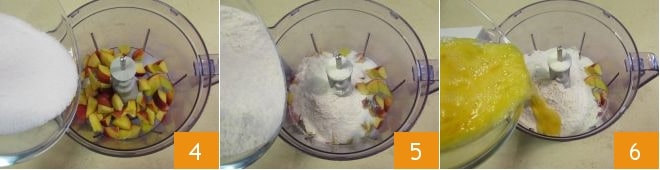 Um das Pfirsichbrot zuzubereiten, beginnen Sie damit, den Ofen auf 180 °C vorzuheizen, dann waschen Sie die Pfirsiche unter fließendem Wasser 1, trocknen Sie sie ab und schneiden Sie sie in ziemlich grobe Stücke 2: Sie benötigen 285 g Pfirsichfleisch. Wiegen Sie alle Zutaten sorgfältig ab und geben Sie sie in den Mixer: Zuerst geben Sie die Pfirsichspalten hinzu 3,