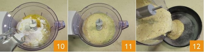 und die Milch 10. Starten Sie die Klingen und pürieren Sie alles, bis eine cremige Masse entsteht 11. Fetten und mehlen Sie eine Kuchenform mit einem Durchmesser von 22 cm ein und geben Sie die Masse hinein 12.