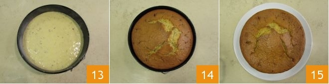Der Teig ist bereit zum Backen 13, backen Sie ihn im vorgeheizten Ofen bei 180 °C für 60 Minuten. Nach dem Backen holen Sie das Pfirsichbrot aus dem Ofen 14 und lassen Sie es abkühlen, bevor Sie es in Scheiben schneiden 15.