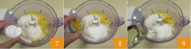 das Backpulver 7, aromatisieren Sie mit Zitronenschale 8 und zum Schluss geben Sie die Flüssigkeiten hinzu: das Pflanzenöl 9