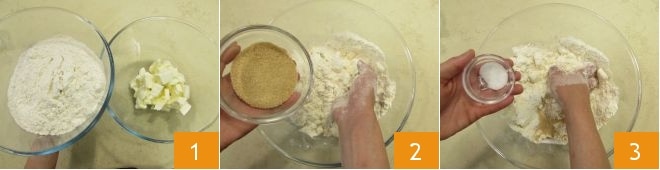 Um den Pfirsichkuchen zuzubereiten, bereitet zuerst den Teig vor: In einer Schüssel kalte Butter in Stückchen mit dem Mehl 1 vermengen und mit den Händen krümelig verreiben, bis eine sandige Konsistenz erreicht ist, dann den braunen Zucker 2 und das Salz 3 hinzufügen und weiter mit den Händen arbeiten.