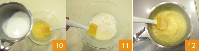Wenn die Milch fast kocht, in die Schüssel mit der Eimischung gießen 10, gut umrühren 11, dann alles wieder in den Topf geben und bei niedriger Hitze unter ständigem Rühren eindicken lassen, bis eine eher flüssige und nicht zu kompakte Konsistenz erreicht ist 12.