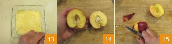 Die fertige Creme in einen flachen und breiten Behälter geben, mit Frischhaltefolie abdecken 13, abkühlen lassen und für mindestens 30 Minuten im Kühlschrank kaltstellen. In der Zwischenzeit die Pfirsiche für die Füllung vorbereiten: waschen, halbieren, den Kern entfernen 14 und die Schale mit einem Schälmesser entfernen 15, dann beiseitelegen.