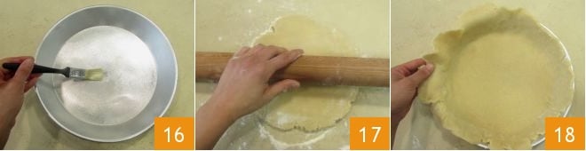 Nach der Ruhezeit des Teigs eine Springform mit einem Durchmesser von 22 cm am Boden und einem oberen Durchmesser von 26 cm einfetten 16. Die zwei Teigportionen aus dem Kühlschrank nehmen und mit einem Nudelholz auf der leicht bemehlten Arbeitsfläche auf 4 mm Dicke ausrollen 17. Den Boden der Form mit einer der beiden Teigplatten auskleiden, dabei auch die Ränder gut bedecken, dann den überschüssigen Teig entfernen 18.