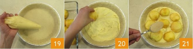 Jetzt die mittlerweile abgekühlte Creme in einen Spritzbeutel füllen und fast vollständig auf dem Boden der Torte verteilen, sodass eine gleichmäßige und reichhaltige Schicht entsteht 19. Die Pfirsiche mit der Schnittfläche nach unten legen 20 und mit einem Löffel braunem Zucker bestreuen 21.