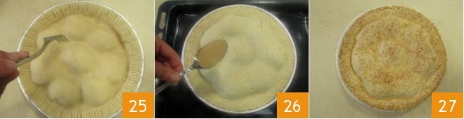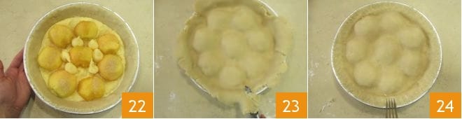 Die verbleibenden Zwischenräume mit der restlichen Creme füllen, dann die zweite Teigplatte auf die Torte legen und vorsichtig mit den Fingern andrücken, sodass sie sowohl an den Rändern als auch an den Pfirsichen haftet, sodass deren Form von außen sichtbar ist. Überschüssigen Teig mit einem Messer entfernen 23, dann die Ränder durch Andrücken mit den Fingern versiegeln und mit den Zinken einer Gabel abschließen 24.
