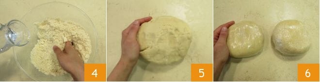 Nun das kalte Wasser nach und nach dazugeben 4 und weiter kneten, bis der Teig gut homogen ist, dann auf die Arbeitsfläche geben und eine Kugel formen 5. Den Teig halbieren, sodass zwei etwa 450 g schwere Portionen entstehen, in Frischhaltefolie wickeln 6 und für etwa eine Stunde in den Kühlschrank legen.