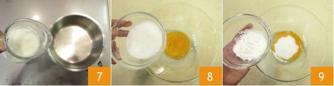 Während der Teig ruht, kann die Creme vorbereitet werden: Die Milch in einen Topf gießen 7 und fast zum Kochen bringen; in der Zwischenzeit die Eigelbe in eine separate Schüssel geben, Zucker 8 und Stärke 9 hinzufügen und gut vermischen, um alles zu verbinden.
