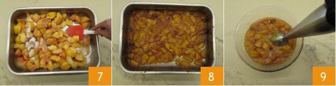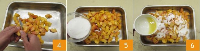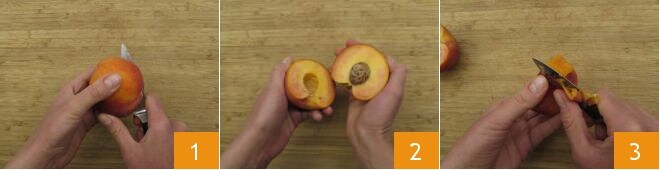 Um die Pfirsichkonfitüre im Ofen zuzubereiten, vergewissern Sie sich zuerst, dass Sie neue Deckel und sterilisierte Gläser haben (folgen Sie den Anweisungen des Gesundheitsministeriums am Ende des Rezepts). Dann waschen Sie die Pfirsiche, teilen sie mit einem Messer in Hälften 1 und entfernen dabei den Kern 2. Danach schälen Sie sie 3