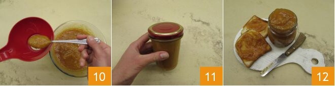 Füllen Sie die Gläser 10 und verschließen Sie sie, indem Sie den Deckel festschrauben 11. Dann drehen Sie das Glas um und lassen es vollständig abkühlen. Wenn die Konfitüre noch heiß ist, wird sich das Vakuum automatisch bilden, andernfalls können Sie sie sicherheitshalber in einen Topf mit Wasser (ca. 0,5 cm vom Deckel entfernt) stellen und das Ganze zum Kochen bringen. Vor dem Verzehr 12, stellen Sie sicher, dass das Vakuum sich gebildet hat, indem Sie in die Mitte des Deckels drücken: Wenn es Klick-Klack macht, bedeutet das, dass das Vakuum nicht korrekt gebildet wurde und die Konfitüre nicht verzehrt werden kann.