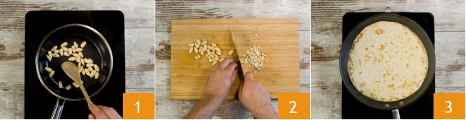 Um die Piadina mit rohem Schinken und Mascarpone zuzubereiten, rösten Sie die Mandeln, die die knusprige Note der Füllung sein werden. Rösten Sie sie in einer Pfanne ohne Zugabe von Fett bei mittlerer bis niedriger Hitze 1. Hacken Sie sie mit einem Messer 2. Erwärmen Sie eine der beiden Piadinen in einer bereits heißen Pfanne, warten Sie 30 Sekunden und drehen Sie sie dann um 3, um sie auch auf der anderen Seite zu erwärmen.