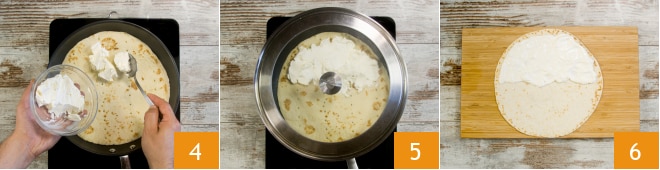 Jetzt streichen Sie die Hälfte des Mascarpones auf die Hälfte der Piadina 4, decken Sie die Pfanne mit einem Deckel ab und warten Sie eine weitere Minute 5. Legen Sie die Piadina auf ein Schneidebrett 6,