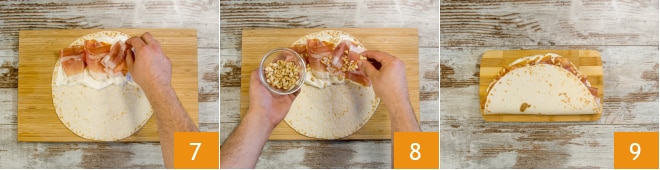 fügen Sie ein paar Scheiben rohen Schinken 7 und die Hälfte der gerösteten Mandeln 8 hinzu. Falten Sie sie zur Hälfte 9, bereiten Sie die andere Piadina auf die gleiche Weise zu und genießen Sie sie noch warm!