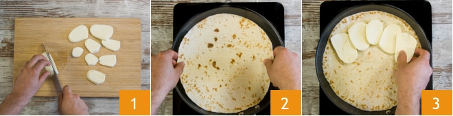 Um die Piadina mit Schinken und Scamorza zuzubereiten, schneiden Sie zuerst letzteren in 0,5 cm dicke Scheiben 1. Legen Sie die Piadina in eine Pfanne und erhitzen Sie sie für 30 Sekunden 2, dann wenden Sie sie und legen Sie auf eine Seite die Hälfte der Scamorza-Scheiben 3.