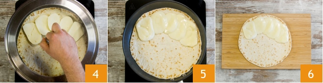 Decken Sie die Piadina mit einem Deckel ab 4 und warten Sie weitere 30 Sekunden, bis der Käse geschmolzen ist 5. Legen Sie die Piadina dann auf ein Schneidebrett 6,