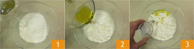 Um die Piadina ohne Schmalz zuzubereiten, nehmen Sie eine große Schüssel und geben Sie das Mehl, das Wasser 1, das Öl 2 und das Salz 3 hinein.