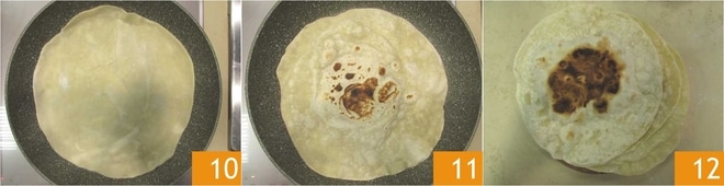 Erhitzen Sie eine große Pfanne gut und backen Sie eine Piadina nach der anderen für etwa 2-3 Minuten pro Seite, indem Sie sie mit der Hand drehen, um Luftblasen zu vermeiden 10 11. Stapeln Sie die Piadinas übereinander, sobald sie fertig sind 12. Ihre Piadina ohne Schmalz ist bereit, gefüllt und genossen zu werden!