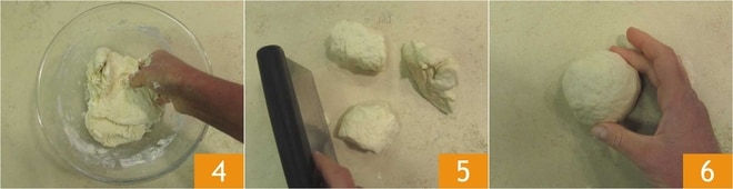 Kneten Sie schnell mit den Händen, um eine kompakte und homogene Masse zu erhalten 4, dann geben Sie den Teig auf die Arbeitsfläche und teilen ihn mit einem Teigschaber in 4 Teile 5. Formen Sie schnell jede Teigportion, indem Sie sie zwischen den Händen rollen 6.