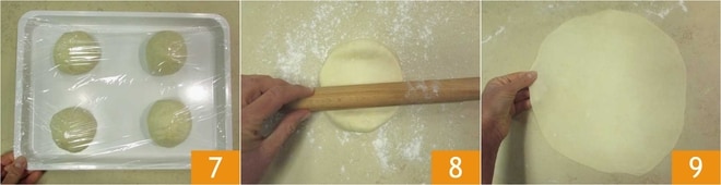 Legen Sie die entstandenen Kugeln auf ein Tablett, decken Sie sie mit Frischhaltefolie ab und lassen Sie sie 30 Minuten bei Raumtemperatur ruhen 7. Nach dieser Zeit rollen Sie jede Kugel mit einem Nudelholz auf einer leicht bemehlten Fläche aus 8 bis zu einer Dicke von 2-3 mm 9.