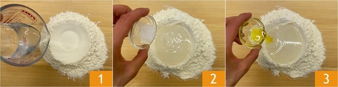 Um die Pici Cacio e Pepe zuzubereiten, bereiten Sie zuerst den Teig vor: Geben Sie das Mehl auf die Arbeitsfläche und formen Sie eine Mulde, dann geben Sie das lauwarme Wasser 1, das Salz 2 und das Öl 3 hinzu.