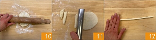 Bestäuben Sie die Arbeitsfläche leicht mit Mehl und rollen Sie den Teig mit einem Nudelholz auf eine Dicke von 1 cm aus 10, dann schneiden Sie ihn in Streifen 11. Arbeiten Sie mit den Handflächen, um lange, dünne, gleichmäßige Schnüre zu formen 12.